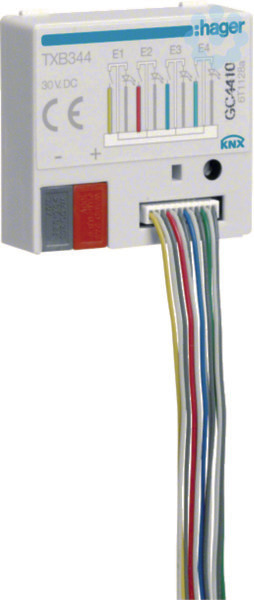 Binäreingang 4-fach + 4 LED Ausgänge KNX, Unterputz. KNX Binäreingang UP, 4-fach Eingang/4-fach LED Ausgang. 4 unabhängige UP-Eingänge zum Anschluss von handelsüblichen Tastern, Schaltern oder potenzialfreien Kontakten. Zusätzlich 4 frei parametrierbare Ausgänge zur LED Ansteuerung. Die Abfragespannung stellt das Eingangsgerät zur Verfügung. Das Gerät setzt die Schaltinformationen in Befehle um. Funktionen, Beleuchtungs-, Jalousie-, Rollladen- und/oder Heizungssteuerung, Szenenabruf, 2-Kanal Modus sind für jeden Eingang frei definierbar.