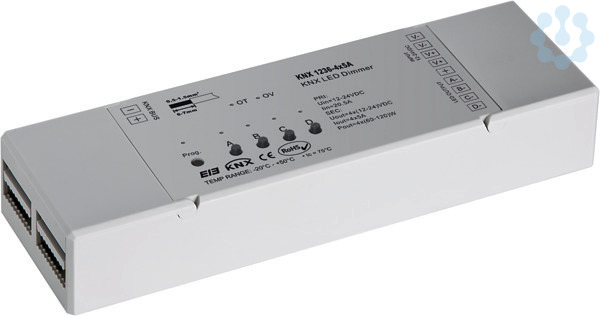 Der KNX-Dimm-Aktor kann sowohl fuer Unicolor, als auch fuer RGB-Leuchten verwendet werden. Die entsprechende Einstellung der Steuerung erfolgt ueber ETS. Geeignet fuer LED-Leuchten mit 12, 24 und 36V/DC Betriebsspannung. Die tatsächliche Eingangsspannung ist abhängig von der benötigten Spannung der zu versorgenden Leuchten. Anschluesse: 1x Eingang fuer KNX-Bus, 1x Eingang fuer 12-36V/DC zur Spannungsversorgung und 4x Ausgang. Die Schraubklemmen sind fuer Kabel von 0,5mm². - 1,5mm². geeignet. Technische Daten: ta: -20°.C - 50°.C, tc: 75°.C, max. Ausgangsleistung je Kanal: 5A. 60W bei 12V/DC, 120W bei 24V/DC und 180W bei 36V/DC.