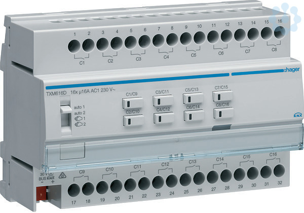Schalt-/Jalousieaktor 16/8-fach KNX easy, 16A, C-Last. Schalt-/Jalousieaktor REG zum Schalten einer unabhängigen Last je Aktorkanal oder Ansteuerung eines Jalousieantriebes über je zwei Aktorkanäle, beliebiger Mixbetrieb aus Antriebs- und Schaltfunktionen. Reiheneinbaugerät mit integriertem Busankoppler, Steckklemmen für KNX Busanschluss, Last-/Schaltanschlüsse und Beschriftungsfeld. 8 Bedientasten (Schaltkanal 1-8 und Umschaltung auf Kanal 9-16) für Handbetrieb je Ausgang mit Status-LED (Einflächenbedienung). Schiebeschalter Auto/Hand, beleuchtete Programmier-Taste. Funktionen: Steuerungsmöglichkeiten der Schaltkanäle für EIN/AUS, Zeitschalterfunktion mit Ausschaltvorwarnung und Zwangssteuerung mit der jeweiligen Statusanzeige. Automatikfunktion de-/aktivierbar und Lastabwurf durch Kanalabschaltung mit der höchsten Priorität möglich. 64 Szenenfunktionen pro Kanal einstellbar. Rollladen-/Jalousiefunktion im Auf-/Ab-Betrieb mit Lamellenwinkelverstellung, Positionierungsfunktion und Lamellenverstellung für Jalo