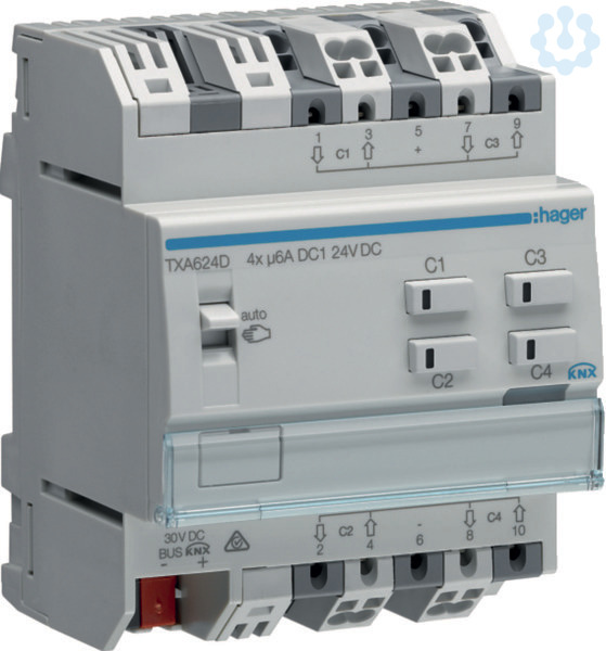 Rollladen-/Jalousieaktor 4-fach KNX easy, 24V. Jalousieaktor REG zur Ansteuerung eines DC-Antriebes je Aktorkanal für Jalousien, Rollladen oder Markisen. Reiheneinbaugerät mit integriertem Busankoppler, QuickConnect Steckklemmen für KNX Busanschluss, Lastanschlüsse und Beschriftungsfeld. Bedientaste für Handbetrieb je Ausgang mit Status-LED (Einflächenbedienung). Schiebeschalter Auto/Hand, beleuchtete Programmier-Taste. Funktionen: Rollladen-/Jalousiefunktion im Auf-/Ab-Betrieb mit Lamellenwinkelverstellung, Positionierungsfunktion und Lamellenverstellung für Jalousie in Prozent-Parametrierung. Statusobjekte für die Position der Lamellen in Prozent und der oberen/unteren Endlage. Zwangssteuerung mit Statusanzeige und 3 Alarmobjekte mit unterschiedlicher Prioritätssteuerung. Automatikfunktion de-/aktivierbar, 64 Szenenfunktionen pro Kanal und einstellbarer Sonnenschutzfunktion. Hinweis: Das Gerät lässt sich mittels easy Inbetriebnahme-Tool, easy-Konfigurationsserver oder der ETS (ab Version 4) programmieren. H