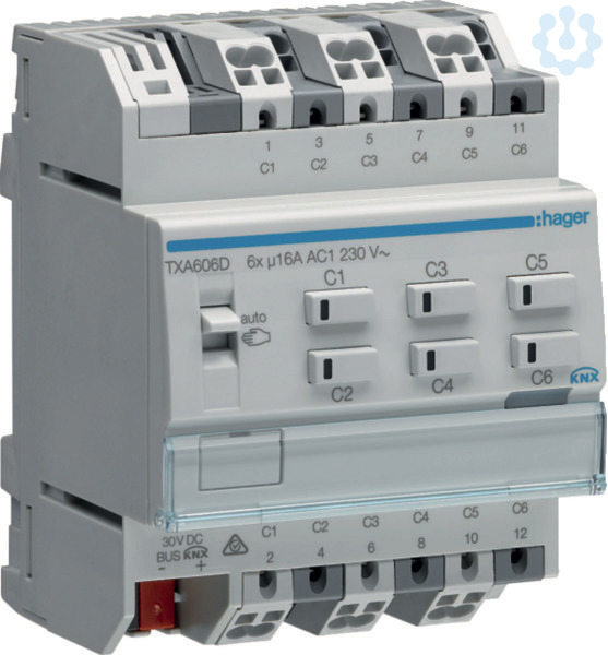 Schalt-/Jalousieaktor 6/3-fach KNX easy, 16A, C-Last. Schalt-/Jalousieaktor REG zum Schalten einer unabhängigen Last je Aktorkanal oder Ansteuerung eines Jalousieantriebes über je zwei Aktorkanäle, beliebiger Mixbetrieb aus Antriebs- und Schaltfunktionen. Reiheneinbaugerät mit integriertem Busankoppler, QuickConnect Steckklemmen für KNX Busanschluss, Last-/Schaltanschlüsse und Beschriftungsfeld. Bedientaste für Handbetrieb je Ausgang mit Status-LED (Einflächenbedienung), Schiebeschalter Auto/Hand und beleuchtete Programmier-Taste. Funktionen: Steuerungsmöglichkeiten der Schaltkanäle für EIN/AUS, Zeitschalterfunktion mit Ausschaltvorwarnung und Zwangssteuerung mit der jeweiligen Statusanzeige. Automatikfunktion de-/aktivierbar und Lastabwurf durch Kanalabschaltung mit der höchsten Priorität möglich. 64 Szenenfunktionen pro Kanal einstellbar. Rollladen-/Jalousiefunktion im Auf-/Ab-Betrieb mit Lamellenwinkelverstellung, Positionierungsfunktion und Lamellenverstellung für Jalousie in Prozent-Parametrierung. Statu