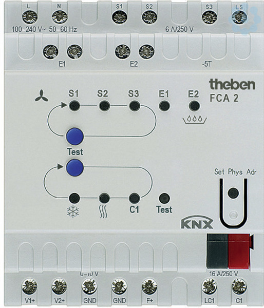 Fan Coil Aktor, 4 TE, steuert Fan Coils mit bis zu 3 Lüfterstufenm wahlweise mit 0-10 V Ausgang (8 A) und das Heiz-bzw. Kühlventil (Triacs), Es werden 2 Rohr und 4 Rohr-Systeme unterstützt, Dabei können Proportional 0-10 V Ventile angesteuert werden, Über ein Zusatzrelais (16 A) ist das Ansteuern von wahlweise eines elektrischen Heizregisters oder eines elektrischen Kühlregisters möglich