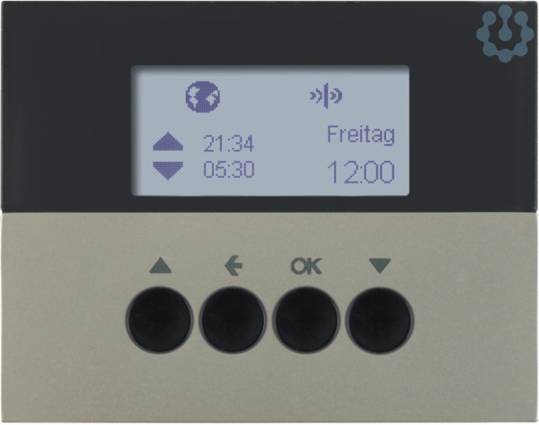 KNX-Funk Jalousie-Schaltuhr quicklink K.5 edelstahl, lackiert. KNX-Funk Jalousie-Taste quicklink zur Steuerung über Gerätetasten, Funk-Sender und programmierte Schaltzeiten. Integration via KNX-Funk Medienkoppler ins KNX-TP-System. Mit automatischer Sommer-/Winterzeit-Umschaltung (abschaltbar), Umschaltung Hand-/Automatikbetrieb, Anzeige der Aufsatz-/Einsatz-Kompatiblität im Display, LC-Display-Kontrast einstellbar, LC-Display leuchtet während der Bedienung. Funktionen: Resetfunktion (auf Werkseinstellung), mit Tastensperre, Party-Funktion, keine Ausführung von Automatik-, Funk- und Nebenstellenbefehlen (Aussperrsicherung), Sende- und/oder Empfangsverhalten konfigurierbar. Astroprogramm für Schalten bei Sonnenaufgang/-untergang mit Stadt/Land oder Koordinateneingabe, individuell anpassbar. Standalone-Programm Funk- und Nebenstellen-Befehle werden nicht ausgeführt, Ferien-Programm zur zufälligen Variation der Fahrzeiten im Automatikbetrieb. Lamellenstand für Szene speicherbar, Aufrufen der Szenen über KNX-Funk