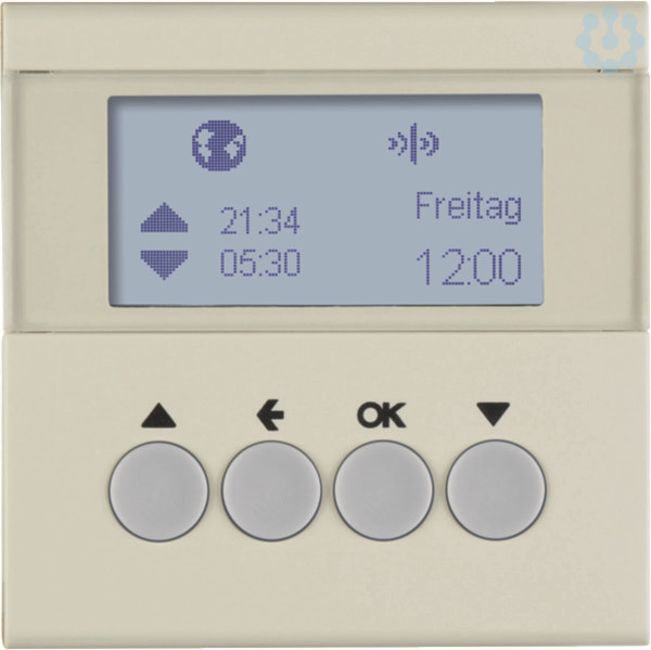 KNX-Funk Jalousie-Schaltuhr quicklink S.1 weiß, glänzend. KNX-Funk Jalousie-Taste quicklink zur Steuerung über Gerätetasten, Funk-Sender und programmierte Schaltzeiten. Integration via KNX-Funk Medienkoppler ins KNX-TP-System. Mit automatischer Sommer-/Winterzeit-Umschaltung (abschaltbar), Umschaltung Hand-/Automatikbetrieb, Anzeige der Aufsatz-/Einsatz-Kompatiblität im Display, LC-Display-Kontrast einstellbar, LC-Display leuchtet während der Bedienung. Funktionen: Resetfunktion (auf Werkseinstellung), mit Tastensperre, Party-Funktion, keine Ausführung von Automatik-, Funk- und Nebenstellenbefehlen (Aussperrsicherung), Sende- und/oder Empfangsverhalten konfigurierbar. Astroprogramm für Schalten bei Sonnenaufgang/-untergang mit Stadt/Land oder Koordinateneingabe, individuell anpassbar. Standalone-Programm Funk- und Nebenstellen-Befehle werden nicht ausgeführt, Ferien-Programm zur zufälligen Variation der Fahrzeiten im Automatikbetrieb. Lamellenstand für Szene speicherbar, Aufrufen der Szenen über KNX-Funk Gerä