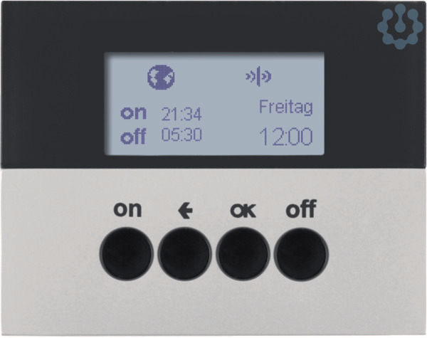 KNX-Funk Zeitschaltuhr quicklink K.5 alu, lackiert. KNX-Funk Zeitschaltuhr quicklink mit Display zum Aufstecken auf passende Einsätze. Integration via KNX-Funk Medienkoppler AP ins KNX-TP-System. LC-Display leuchtet während der Bedienung, Anzeige der Aufsatz-/Einsatz-Kompatiblität im Display, LC-Display-Kontrast einstellbar. Mit automatischer Sommer-/Winterzeit-Umschaltung (abschaltbar), Resetfunktion (auf Werkseinstellung), Sende- und/oder Empfangsverhalten konfigurierbar, Party-Funktion, keine Ausführung von Automatik-, Funk- und Nebenstellenbefehlen (Schaltsicherung), mit Tastensperre, mit Umschaltung Hand-/Automatikbetrieb. Astroprogramm für Schalten bei Sonnenaufgang/-untergang mit Stadt/Land oder Koordinateneingabe, individuell anpassbar, Standalone-Programm Funk- und Nebenstellen-Befehle werden nicht ausgeführt, Ferien-Programm zur zufälligen Variation der Schaltzeiten im Automatikbetrieb, 2 unabhängige voreingestellte Programmspeicher individuell anpassbar. Menüführung in Deutsch, Englisch oder Franzö