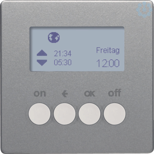 KNX-Funk Zeitschaltuhr quicklink Q.1/Q.3 alu samt, lackiert. KNX-Funk Zeitschaltuhr quicklink mit Display zum Aufstecken auf passende Einsätze. Integration via KNX-Funk Medienkoppler AP ins KNX-TP-System. LC-Display leuchtet während der Bedienung, Anzeige der Aufsatz-/Einsatz-Kompatiblität im Display, LC-Display-Kontrast einstellbar. Mit automatischer Sommer-/Winterzeit-Umschaltung (abschaltbar), Resetfunktion (auf Werkseinstellung), Sende- und/oder Empfangsverhalten konfigurierbar, Party-Funktion, keine Ausführung von Automatik-, Funk- und Nebenstellenbefehlen (Schaltsicherung), mit Tastensperre, mit Umschaltung Hand-/Automatikbetrieb. Astroprogramm für Schalten bei Sonnenaufgang/-untergang mit Stadt/Land oder Koordinateneingabe, individuell anpassbar, Standalone-Programm Funk- und Nebenstellen-Befehle werden nicht ausgeführt, Ferien-Programm zur zufälligen Variation der Schaltzeiten im Automatikbetrieb, 2 unabhängige voreingestellte Programmspeicher individuell anpassbar. Menüführung in Deutsch, Englisch od