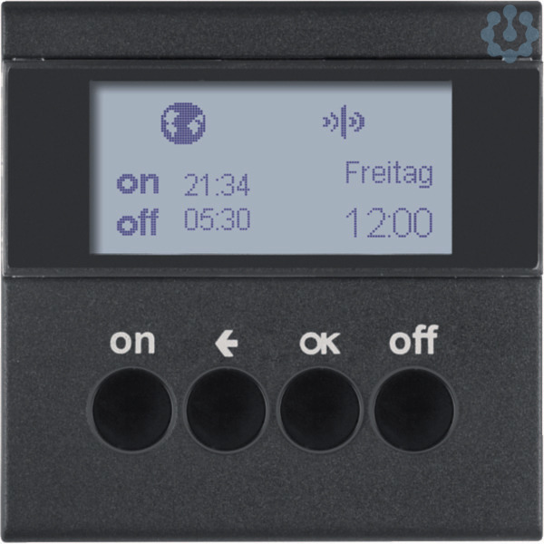 KNX-Funk Zeitschaltuhr quicklink S.1/B.3/B.7 anthrazit, matt. KNX-Funk Zeitschaltuhr quicklink mit Display zum Aufstecken auf passende Einsätze. Integration via KNX-Funk Medienkoppler AP ins KNX-TP-System. LC-Display leuchtet während der Bedienung, Anzeige der Aufsatz-/Einsatz-Kompatiblität im Display, LC-Display-Kontrast einstellbar. Mit automatischer Sommer-/Winterzeit-Umschaltung (abschaltbar), Resetfunktion (auf Werkseinstellung), Sende- und/oder Empfangsverhalten konfigurierbar, Party-Funktion, keine Ausführung von Automatik-, Funk- und Nebenstellenbefehlen (Schaltsicherung), mit Tastensperre, mit Umschaltung Hand-/Automatikbetrieb. Astroprogramm für Schalten bei Sonnenaufgang/-untergang mit Stadt/Land oder Koordinateneingabe, individuell anpassbar, Standalone-Programm Funk- und Nebenstellen-Befehle werden nicht ausgeführt, Ferien-Programm zur zufälligen Variation der Schaltzeiten im Automatikbetrieb, 2 unabhängige voreingestellte Programmspeicher individuell anpassbar. Menüführung in Deutsch, Englisch o