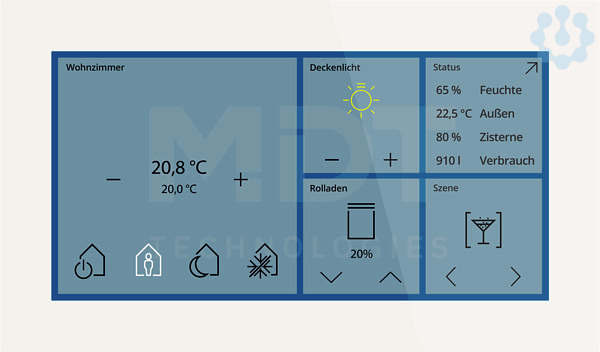KNX Glas Touch Smart 6 Zoll, KNX Secure, Weiß. Ausführung mit 6 Zoll Farbdisplay und umlaufendem weißen Orientierungslicht. Bis zu 64 Funktionen und bis zu 12 Statusanzeigen im Standby. Multifunktionstaster mit kapazitivem, hochauflösendem 6 Zoll TFT-Farbdisplay (1440 x 720 Pixel). Hochwertiges Design aus Glas und gebürstetem Aluminium. Intuitive Bedienoberfläche zur einfachen Steuerung der Raumfunktionen. Umlaufendes weißes Orientierungslicht. Bis zu 64 Funktionen auf individuellen Ebenen und bis zu 12 Statusanzeigen im Standby. Raumfunktionen: Schalten, Dimmen, Tunable White, HSV, RGB, RGBW, Sonnenschutz, HVAC. Sprungfunktion für schnellen Seitenwechsel. Komfortabler Raumtemperaturregler mit Temperatursensor für Heiz- und Kühlbetrieb. Logikfunktionen, Szenensteuerung, Innovative Gruppensteuerung. Anzeige von Statusinformationen (1 Bit) und Meldungen (14 Byte). Schutz vor unberechtigtem Zugriff durch Codeschloss-Funktion (1 Nutzer). Individuelle Gestaltung nach Kundenwunsch (Logo, Hintergrundbild, Designfarb