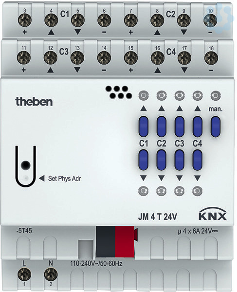 KNX Jalousieaktor, 4-fach 24V Antriebssteuerung, Reiheneinbaugerät, Breite 4 TE, Relaisausgänge für 4 24V Antriebe, Antriebe: z. B. für Jalousien, Rollladen, Markisen, manuelle Bedienung am Gerät, Schlupfkorrektur, Antrieb frei parametrierbar, Handschalter AUF/AB und LEDs, 4 Wechsler