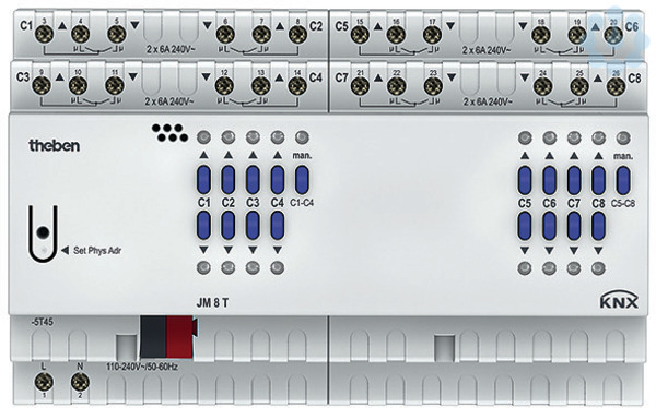 KNX Jalousieaktor, 8-fach Antriebssteuerung, Reiheneinbaugerät, Breite 8 TE, Relaisausgänge für 8 Antriebe, Antriebe: z. B. für Jalousien, Rollladen, Markisen, manuelle Bedienung am Gerät, Schlupfkorrektur, Antrieb frei parametrierbar, Handschalter AUF/AB und LEDs, 8 Schließer