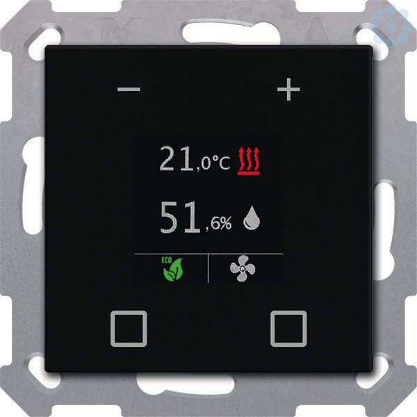 KNX Raumtemperaturregler Smart 55, Schwarz matt. Mit Farbdisplay, Temperatur-/Feuchtesensor und 4 Eingängen. Montage in Schalterdose. Integrierter Busankoppler. Passend für 55 mm Schalterprogramme z.B.: GIRA E2 oder BERKER B3, B7 oder JUNG A550 oder MERTEN M-Pure. Aktives Farbdisplay zur Funktions- und Statusanzeige. Hintergrundfarbe w/s und Displayhelligkeit einstellbar. Anzeige von Soll- und Isttemperatur. Raumtemperaturregler für Innenräume. Messbereich -10 bis +50 °C. Reglertyp (2-Punkt, PI, PWM) auswählbar. Einfache Sollwertverschiebung über separate +/- Tasten. 1Bit +/-, 1Byte oder 2Byte Absolutobjekt zur Sollwertverstellung. Speicherung der Sollwerte bei Busspannungsausfall. Grenzwerte Min/Max, Frostalarm, Min/Max Speicher. Umschaltung der Betriebsart über Bit/Byte Objekte. Temperatur- und Feuchtesensor mit Berechnung des Taupunktes. Meldung beim Verlassen des Behaglichkeitsbereiches. 4 Binäreingänge zum Anschließen von potentialfreien Kontakten (Taster, Schalter, Fensterkontakte). Lüftungssteuerung mi