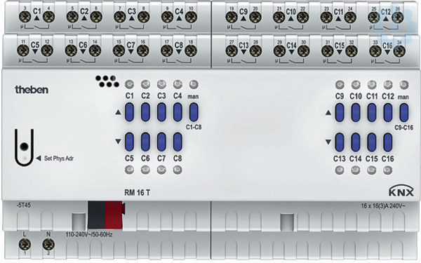 KNX Schalt-/Jalousieaktor mit Relaisausgängen für 16 Schaltkanäle bzw. 8 Jalousiekanäle, Reiheneinbaugehäuse Breite 8 TE, LED Schaltzustandsanzeige für jeden Kanal, Handschalter mit Statusanzeige (auch ohne Busspannung), Verknüpfungen, Kontaktart (Öffner/Schließer) und Teilnahme an Zentralbefehlen wie Dauer-Ein, Dauer-Aus, Zentral-Schalten und Szene speichern/abrufen, Schaltfunktionen: Ein/Aus, Impuls, Ein/Aus-Verzögerung, Treppenlicht mit Vorwarnen nach DIN 18015-2, logische Verknüpfungen: Sperren, UND, Freigeben, ODER. Rückmelde-Objekt für jeden Kanal, Zentral-Objekte mit und ohne Priorität, Szenen abrufen und speichern (Objekt), Szenenobjekt für jeden Kanal