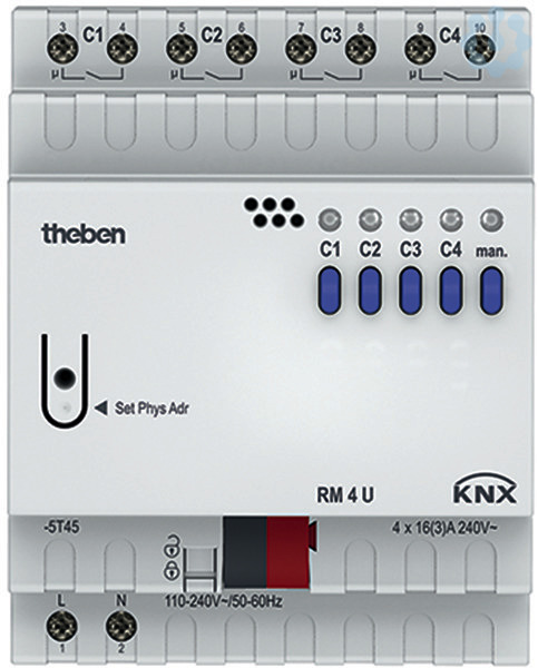 KNX Schaltaktor mit Relaisausgängen für 4 Schaltkanäle, Reiheneinbaugehäuse Breite 4 TE, LED Schaltzustandsanzeige für jeden Kanal, Handschalter mit Statusanzeige (auch ohne Busspannung), Verknüpfungen, Kontaktart (Öffner/Schließer) und Teilnahme an Zentralbefehlen wie Dauer-Ein, Dauer-Aus, Zentral-Schalten und Szene speichern/abrufen, Schaltfunktionen: Ein/Aus, Impuls, Ein/Aus-Verzögerung, Treppenlicht mit Vorwarnen nach DIN 18015-2, logische Verknüpfungen: Sperren, UND, Freigeben, ODER. Rückmelde-Objekt für jeden Kanal, Zentral-Objekte mit und ohne Priorität, Szenen abrufen und speichern (Objekt), Szenenobjekt für jeden Kanal