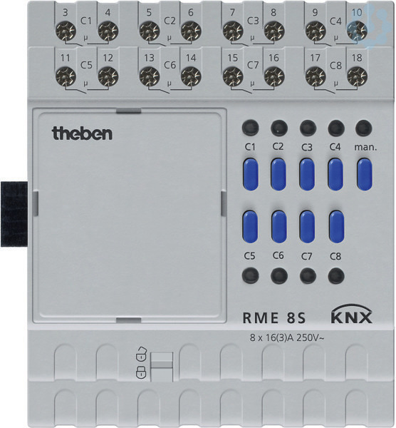 KNX Schaltaktor Erweiterungsgerät mit Relaisausgängen für 8 Schaltkanäle, erweiterbar mit RME 8 S oder mit anderen MIX-Erweiterungsgeräten, Reiheneinbaugehäuse Breite 4 TE, Grundgerät und Busankopplung sind mechanisch trennbar und können unabhängig voneinander getauscht werden. LED Schaltzustandsanzeige für jeden Kanal, Handschalter mit Statusanzeige (auch ohne Busspannung), Verknüpfungen, Kontaktart (Öffner/Schließer) und Teilnahme an Zentralbefehlen wie Dauer-Ein, Dauer-Aus, Zentral-Schalten und Szene speichern/abrufen, Schaltfunktionen: Ein/Aus, Impuls, Ein/Aus-Verzögerung, Treppenlicht mit Vorwarnen nach DIN 18015-2, logische Verknüpfungen: Sperren, UND, Freigeben, ODER. Rückmelde-Objekt für jeden Kanal, Zentral-Objekte mit und ohne Priorität, Szenen abrufen und speichern (Objekt), Szenenobjekt für jeden Kanal