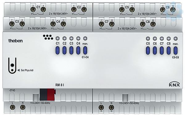 KNX Schaltaktor 8-fach C-Last mit Relaisausgänge für 8 Schaltkanäle, Reiheneinbaugehäuse, Breite 8 TE, LED Schaltzustandsanzeige je Kanal, Handschalter mit Statusanzeige (auch ohne Busspannung), Verknüpfungen, Kontaktart (Öffner/Schließer) und Teilnahme an Zentralbefehlen wie Dauer-Ein, Dauer-Aus, Zentral-Schalten und Szene speichern/abrufen, Schaltfunktionen: Ein/Aus, Impuls, Ein/Aus-Verzögerung, Treppenlicht mit Vorwarnen nach DIN 18015-2, logische Verknüpfungen: Sperren, UND, Freigeben, ODER, Rückmelde-Objekt für jeden Kanal, Zentral-Objekte mit und ohne Priorität, Szenen abrufen und speichern (Objekt), Szenenobjekt für jeden Kanal