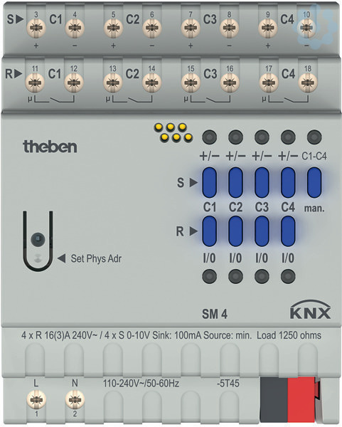KNX Schalt-/Dimmaktor 4-fach, zur Ansteuerung von elektrischen Verbrauchern mit 0-10 V oder 1-10 V Schnittstelle, Reiheneinbaugehäuse, Breite 4 TE, flexible Verwendung der Steuer- und Relaisausgänge?, Steuerausgänge für aktive (0-10 V, Source) als auch passive Steuerung (1-10 V, Sink), sowie Mischbetrieb geeignet?, Unterstützung von Farb- und Farbtemperatursteuerung?, Einfache Inbetriebnahme und Programmierung in der ETS, ohne Zusatz-Tools oder ETS-App?, Sichere Inbetriebnahme und Kommunikation durch Unterstützung von KNX Data Secure, Einschaltstrom max. 800 A, für das zuverlässige Schalten kapazitiver Lasten (ECG und LED-Treiber)