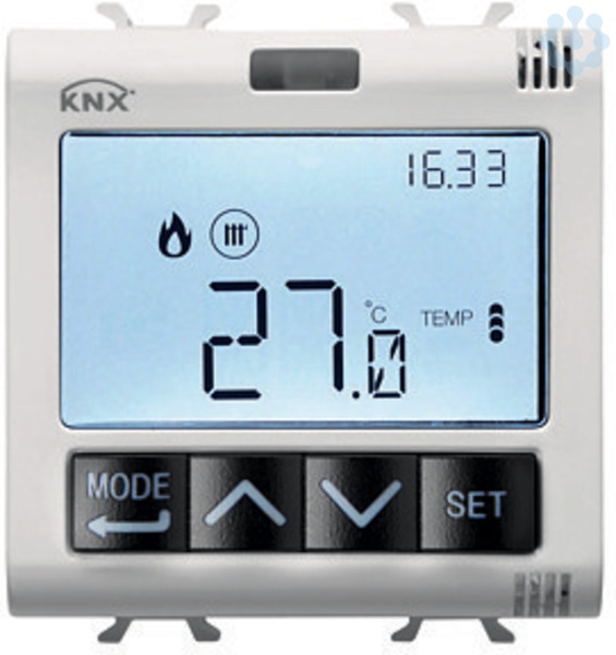 Unterputz- Thermostat mit Feuchtemanagement, zur Steuerung von BUS-Geraeten fuer Heizung/Kuehlung und Befeuchtung/Entfeuchtung und fuer die manuelle Steuerung der Betriebsmodi (Komfort, Standby, Nacht). Fuer 2- und 4-Rohrsysteme: Zwei-Punkt-Regelung (EIN/AUS oder 0%/100%), proportional-integral (PWM oder stetig), Fan-Coil (max. 3 Stufen). Beinhaltet: 1 Ausgang fuer die Steuerung des Magnetventils (oder als allgemeiner Ausgang fuer Schalten, zeitgesteuertes Schalten, Zwangsfuehrung oder Szenen). 1 Eingang fuer potenzialfreie Kontakte (fuer Fensterkontakte, Jalousiesteuerung, Dimmen und Szenen). 1 Eingang fuer den externen NTC Fuehler (z.B. fuer den Schutz der Fußbodenheizung) oder Alternativ als zweiter Eingang fuer potenzialfreie Kontakte. Mit LCD Display und anpassbarer RGB Hinterleuchtung. Inbetriebnahme mit ETS. Kombinierbar mit KNX Unterputz-Chronothermostaten fuer die lokale Temperatureinstellung: In diesem Fall agiert der Thermostat als Slave, der die Temperaturprofile