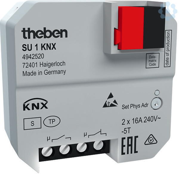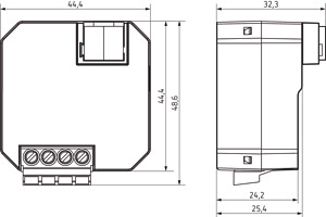 KNX 1-fach Schaltaktor UP, 1x Schließer-, 1x Öffner-Kontakt mit gemeinsamer Ansteuerung, Einstellbare Eigenschaften: Öffner/Schließer, Schalten, Verzögerung, Impulsfunktion, 2 Binäreingänge für potentialfreie Kontakte wie Taster, Schalter, Temperatursensor (I2), Die Binäreingänge sind ab Werk dem Schaltausgang zugewiesen (Funktionstest vor der Programmierung), Integrierte Temperaturüberwachung für erhöhte Betriebssicherheit z.B. bei Überlast