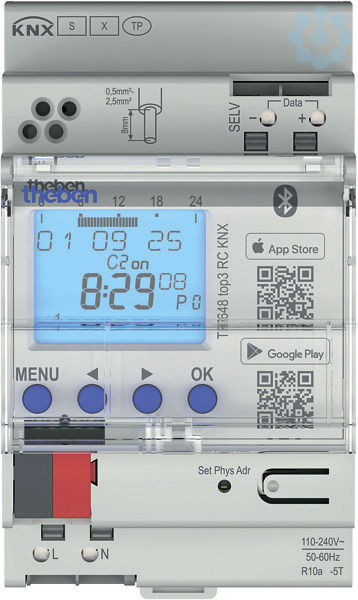 Digitale KNX Zeitschaltuhr mit Jahres-und Astro-Programm, App-Programmierung möglich durch integriertes BLE-Modul, Sichere Inbetriebnahme und Kommunikation durch Unterstützung von KNX Data Secure, Schnittstelle für OBELISK top2 Speicherkarte (PC-Programmierung), Programmiermöglichkeit auch über KNX-Bus, Zeitsynchronisation durch Anschluss einer optionalen externen DCF-oder GNSS/GPS-Antenne, bei GNSS/GPS zusätzlich Positionsbestimmung für Astro-Programm, DuoFix Federsteckklemmen für jeweils 2 Leiter, umfangreiche Jahresuhrfunktionen mit Feiertagsdatenbank und automatischer Fortschreibung, Impulsprogramm, Zyklusprogramm, Schaltungsvorwahl, Dauerschaltung EIN/AUS, Ablauf-Timer, Integrierter Betriebsstundenzähler, Ferienprogramm, 2 Zufallsprogramme, Displaybeleuchtung (abschaltbar), PIN-Codierung, Automatische Sommer-/Winterzeitumschaltung, Zeit-und Datums-Synchronisation von anderen Busteilnehmern