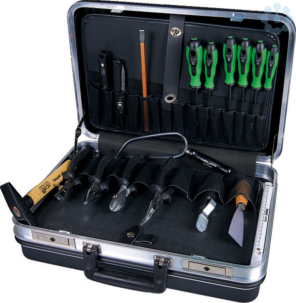 2K-WerkzeugkofferHartschalenkoffer für den Auszubildenden, schwarz, abschließbar, 2 Werkzeugtafeln, eine mit Dokumententasche, Bodenschale mit variablen Trennstegen, 18 Werkzeuge. Koffer 220038.Inhalt: ? 2K-Telefonzange gerade 200 mm ? 2K-Kombizange 180 mm ? 2K-Kraftseitenschneider 180 mm ? 2K-Abisolierzange 160 mm ? 2K-Elektriker-Schraubendreher 2,5 x 75, 3 x 100, 5,5 x 125, 6,5 x 150 mm ? 2K-Kreuzschlitz-Schraubendreher, Gr. 1 + 2 ? Kabelmesser, 1-teilig ? Abmantler Hakenklinge 8 - 28 Ø ? PUK-Taschensäge ? Malerspachtel 40 mm ? Elektriker-Meißel 10 x 250 mm ? Spannungsprüfer 220 - 250 V ? Schlosserhammer 300 g ? Maßstab 2 m