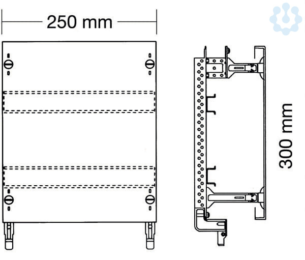 Innenausbausystem, Kombi-Sets, montiert auf EDF-Profil, für Hutprofilschienen für Reihenklemmen horizontal, Rasteinheit 3 RE = 450 mm, Feldbreite 1 = 250 mm, 36 Platzeinheiten, Reihenabstand: 150, Ausbau mit Hutprofilschiene 35 x 7,5 mm mit Lochung für Drahthalter, Abdeckungen aus Kunststoff, 90 Grad Druck-Drehverschluss, RAL 7035, einsetzbar ab einer Schranktiefe von 200 mm, Kombi-Sets werden oben oder unten am Verteilerfeld eingesteckt und auf der anderen Seite am Schrank befestigt. Die EDF-Profilschienen und Feldverbinder sind im Lieferumfang enthalten.