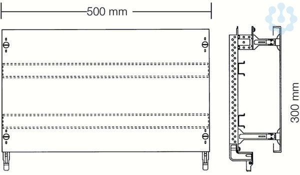 Innenausbausystem, Kombi-Sets, montiert auf EDF-Profil, für Hutprofilschienen für Reihenklemmen horizontal, Rasteinheit 3 RE = 450 mm, Feldbreite 2 = 500 mm, 72 Platzeinheiten, Reihenabstand: 150, Ausbau mit Hutprofilschiene 35 x 7,5 mm mit Lochung für Drahthalter, Abdeckungen aus Kunststoff, 90 Grad Druck-Drehverschluss, RAL 7035, einsetzbar ab einer Schranktiefe von 200 mm, Kombi-Sets werden oben oder unten am Verteilerfeld eingesteckt und auf der anderen Seite am Schrank befestigt. Die EDF-Profilschienen und Feldverbinder sind im Lieferumfang enthalten.
