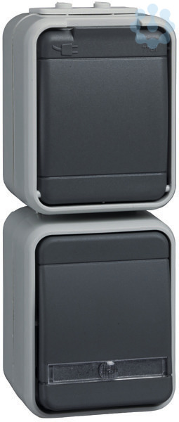 Universalschalter beleuchtet und Steckdose senkrecht. Farbe: licht-/basaltgrau, Kombinationen Schalter 10 A 250V AC/ Schutzkontakt-Steckdose 16 A 250V AC, für Aufputzmontage. Schutzart IP 44, mit zwei Leitungseinführungen, Steckklemmen: Klemmbereich für Kupferleiter 1,5 mm und 2,5 mm, Verbindungsklemmen nach VDE 0620.
