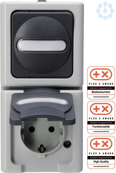 Aufputz-Feuchtraum, Universalschalter (Aus/Wechselschalter) und beleuchtete Schutzkontakt-Steckdosenkombination, beide Geräte mit Beschriftungsfeld, senkrecht, 10AX/16A, 250V~, Schutzart IP44, BLUE LECTRIC, Farbe: grau
