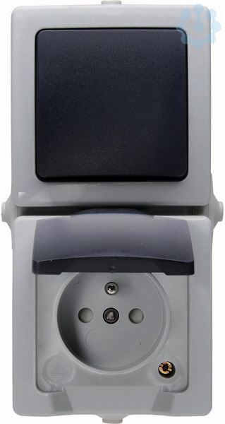 Aufputz-Feuchtraum Aus-/Wechselschalter-Steckdosenkombination im Design NAUTIC und der Farbe grau insenkrechter Ausführrung.Steckdose mit Mittenschut zkontakt und Nennstrom von 16A. Aus-/Wechselschalter mit einem Schaltvermögen von 10AX. Schutzart IP44