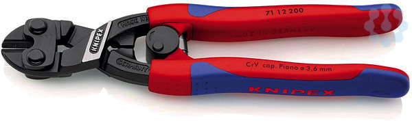 71 12 200 KNIPEX CoBolt® Mit Präzisionsschneiden für weichen, harten Draht sowie Pianodraht. Schneidet Bauteile wie Bolzen, Nägel, Niete usw. bis Ø 5,2 mm. Besonders hohe Schneidleistung bei geringerem Kraftaufwand durch höchst effiziente Gelenkkonstruktion. Schneiden zusätzlich induktiv gehärtet, Schneidenhärte ca. 64 HRC. Mikrostrukturierte Schneide verringert das Rutschen von Schneidmaterialein aus dem Zangenmaul. mit Greiffläche unter dem Gelenk zum Greifen und Ziehen von Drähten ab Ø 1,0 mm. mit schlanken Mehrkomponenten-Hüllen ohne Kragen für besseres Handling und einfacheren Transport. In die Griffhüllen integrierte Öffnungsfeder und Verriegelung für komfortables Arbeiten und sicheren Transport. - Schneidwerte weicher Draht (Durchmesser): Ø 6mm - Schneidwerte mittelharter Draht (Durchmesser): Ø 5,2mm - Schneidwerte harter Draht (Durchmesser): Ø 4,0mm - Schneidwerte Pianodraht (Durchmesser): Ø 3,6mm