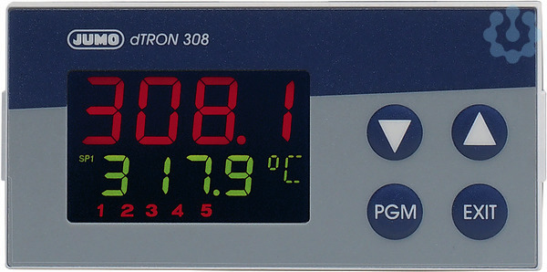 Der PID-Regler zum Schalttafeleinbau besitzt 1 Universaleingang, 2 Relaisausgänge (Wechsler), 2 Binärein-/Ausgänge, 1 Analogausgang und eine Spannungsversorgung für Zweidrahtmessumformer. Der Spannungsversorgungsbereich beträgt AC 110 bis 240 V +10/-15 %, 48 bis 63 Hz. Als Temperaturregler TR nach DIN EN 14 597 kann das Gerät in wärmeerzeugenden Anlagen für die Regelung und Steuerung der Temperatur von flüssigen und gasförmigen Medien verwendet. Das kontrastreiche, mehrfarbige LCD-Display für Istwert, Sollwert und Bedienerführung und besteht aus zwei vierstelligen 7-Segment-Anzeigen. Vier Tasten ermöglichen eine einfache Bedienung. Der Kompaktregler kann als Zweipunkt-, Dreipunkt-, Dreipunkt-Schrittregler oder stetige Regler konfiguriert werden. Die Linearisierungen der üblichen Messwertgeber sind gespeichert, eine kundenspezifische Linearisierungs-Tabelle ist programmierbar. Für die komfortable Konfiguration über einen PC ist ein Setup-Programm lieferbar. Der elektrische Anschluss erfolgt rückseitig über Sch