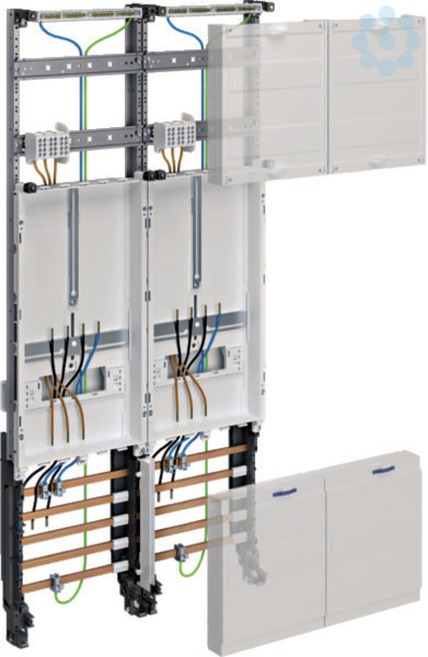 Komplettfeld, universZ, 1050mm, 2 ZP, 2-feld, NRW, SH, MV, N-sachsen, EON-Mitte. Komplettfeld / Einbausatz univers Z für eHZ zum Aufbau von Zählerplätzen nach DIN VDE 0603, Schnellmontage im Schrank durch Rast-System, bestückt und verdrahtet nach VNB TAB-Bestimmungen für eHZ- Zählerplätze nach DIN VDE 0603-1 und DIN VDE 0603-2-1. Anlagenseitiger Anschlussraum: Höhe: 300 mm, 2-reihig mit Hutschienen bestückt mit Hauptleitungsabzweigklemmen nach DIN VDE 0603-3-1, 3-oder 5-polig, fingersicher nach DGUV Vorschrift 3 oder bestückt mit __________ __________ ___________ -Zählerfelder mit integrierter Befestigungs- und Kontaktiereinrichtung (BKE-I) für eHZ zum Einbau von eHZ-Zählertragplatten gemäß DIN VDE 0603-3-2 mit integriertem Zusatzraum (für Kommunikations- und Steuergeräte). Zusatzraum: 1-feldig, Höhe 150 mm, mit Abdeckung geschlossen, Vorprägungen für 12 PLE, plombierbar, mit Hutschiene 12 PLE, Öffnungen für Leitungsführung. Netzseitiger Anschlussraum Höhe 300 mm bestückt mit CU-Sammelschienen, 12 x 5 mm, 5-p