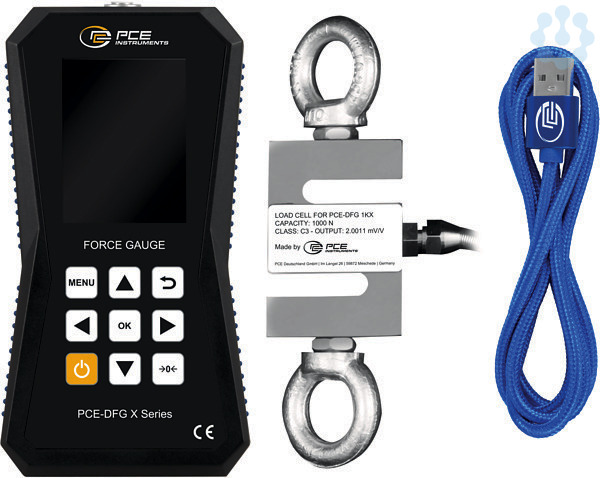 Der interne Speicher von 32 GB bietet Platz für 30 Millionen Messpunkte. Damit können Messprotokolle erstellt, gespeichert und exportiert werden. Das Kraftmessgerät verfügt über eine USB-C Schnittstelle, über die die Messdaten in die PC-Software eingelesen werden können. Das Gerät ist mit einem grafischen LCD ausgestattet, das die Messwerte sowohl numerisch als auch grafisch darstellt. Zusätzlich zeigt ein Balkendiagramm den Messwert