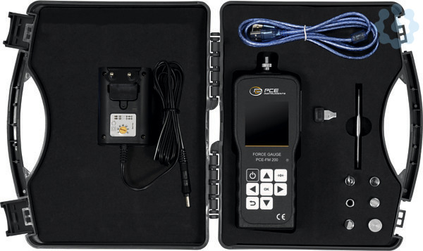 Bei dem Kraftmessgerät handelt es sich um ein Handgerät bis 200 N. Das Kraftmessgerät kann die Einheiten N, kg und lb ermitteln. Im Lieferumfang vom Kraftmessgerät befinden sich verschiedene Adapter, die unterschiedliche Formen aufweisen. Diese können auf das Gerät geschraubt werden und bieten somit die optimale Lösung für unterschiedlich beschaffene Oberflächen bei der Druck- und Zugkraftmessung. Zusätzlich zu den Adaptern wird auch ein Verlängerungsstab geliefert, der Messungen an schwer zugänglichen Orten erlaubt. Dieser Verlängerungsstab besitzt eine Länge von 65 Millimetern. Zum Lieferumfang vom Kraftmessgerät gehören Flachkopfadapter, Hakenadapter, Kugelkopfadapter, Meißelkopfadapter und ein Kerbkopfadapter, wobei der Hakenadapter für Zugkraftmessungen verwendet wird. Das Kraftmessgerät bietet durch Gewinde an der Rückseite des Geräts die Möglichkeit das Kraftmessgerät auf einem Teststand zu befestigen. Teststände werden bei einem Kraftmessgerät immer dann benutzt, wenn reproduzierbare Messergebnisse