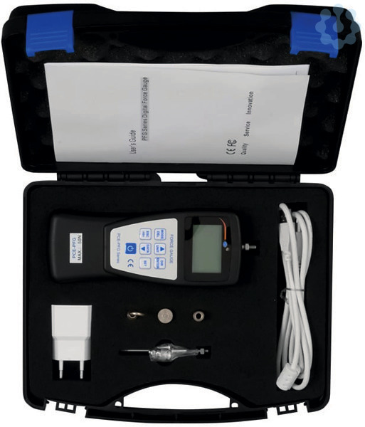 Die Messdaten, sowie eine Statistikauswertung der im Kraftmessgerät gespeicherten Daten (MIN / MAX / Durchschnitt), werden im Grafikdisplay dargestellt und können über die USB Schnittstelle an einen PC übertragen werden. Zusätzlich bietet das Kraftmessgerät eine Grenzwertfunktion MIN / MAX, welche eine mehrfarbige LED (gelb/grün/rot) und Schaltkontakte schalten kann.