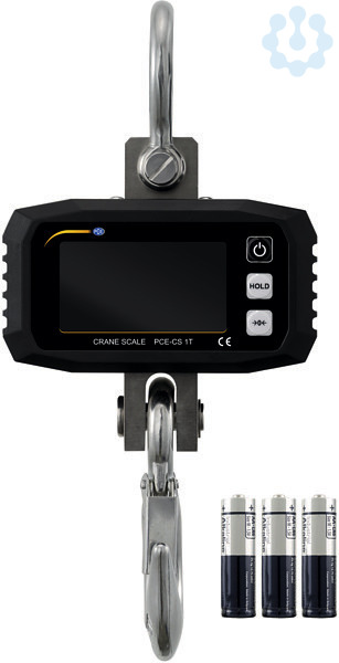 Das robuste Metallgehäuse der Kranwaage erlaubt einen Einsatz im rauen Industriealltag. Betrieben wird die Kranwaage über drei 1,5 V AA Batterien. Über die