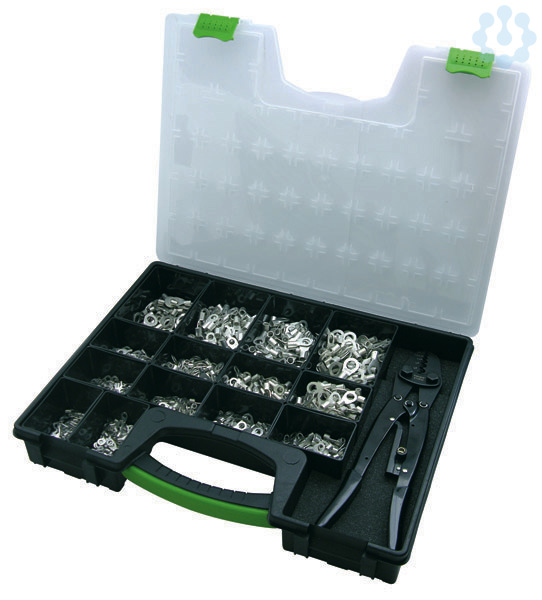 Inhalt: 1.400 Kabelschuhe, Crimpzange (Art. 210830), Pressbereich DIN 0,75-16 mm², Dornverpressung, im Sortimentskasten aus Kunststoff 420 x 350 x 60 mm. 100 Ringkabelschuhe DIN 46234, 16, M10, Art. 290670 100 Ringkabelschuhe DIN 46234, 16, M8, Art. 290668 100 Ringkabelschuhe DIN 46234, 16, M6, Art. 290666 100 Ringkabelschuhe DIN 46234, 10, M10, Art. 290662 100 Ringkabelschuhe DIN 46234, 10, M8, Art. 290660 100 Ringkabelschuhe DIN 46234, 10, M6, Art. 290658 100 Quetschkabelschuhe Ring, 2,5-6, M8, Art. 290642 100 Ringkabelschuhe DIN 46234, 6, M6, Art. 290648 100 Quetschkabelschuhe Ring, 2,5-6, M5, Art. 290638 100 Quetschkabelschuhe Ring, 1,5-2,5, M6, Art. 290632 100 Quetschkabelschuhe Ring, 1,5-2,5, M5, Art. 290630 100 Quetschkabelschuhe Ring, 1,5-2,5, M4, Art. 290628 100 Quetschkabelschuhe Ring, 0,25-1,5, M5, Art. 290624 100 Quetschkabelschuhe Ring, 0,25-1,5, M4, Art. 290622 Sortiment Ringkabelschuhe, nicht isoliert Inhalt: 1.400 Kabelschuhe, Crimpzange (Art. 210830), Pressbereich DIN 0,75-16 mm², Dornverpres