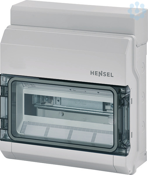 Automatengehäuse, mit 12 Teilungseinheiten, zum Einbau von Geräten mit Schnappbefestigung auf DIN-Tragschiene. Kabeleinführung über integrierte elastische Dichtmembranen. Mit transparenter Tür und Kabeleinführungsblende, integriertem Zubehörfach und Abdeckstreifen für den Geräteausschnitt. Schutzart IP 65.