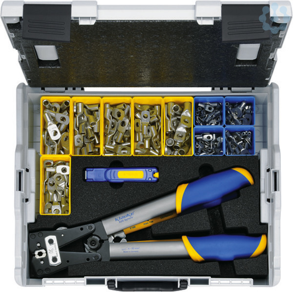 Aus stoß- und schlagfestem ABS-Kunststoff hergestellt. Sehr robust, belastbar bis 100 kg. Über ein Easy-Klick-System stapelbar, das sich leicht öffnen und schließen lässt. Lieferumfang: Presswerkzeug für Rohrkabelschuhe und Verbinder Normalausführung 6 - 50 mm² (K05) 1 Stück, Hand-Schneidwerkzeug für Al- und Cu-Kabel bis Durchmesser 14 mm (K100) 1 Stück, Kabelmesser, ohne Klinge 4 - 16 mm (KL740416) 1 Stück, Rohrkabelschuh ohne Sichtloch, 6 mm², M6, Cu verzinnt (1R6) 25 Stück, Rohrkabelschuh ohne Sichtloch, 6 mm², M8, Cu verzinnt (1R8) 25 Stück, Rohrkabelschuh ohne Sichtloch, 10 mm², M6, Cu verzinnt (2R6) 25 Stück, Rohrkabelschuh ohne Sichtloch, 10 mm², M8, Cu verzinnt (2R8) 25 Stück, Rohrkabelschuh ohne Sichtloch, 16 mm², M10, Cu verzinnt (3R10) 25 Stück, Rohrkabelschuh ohne Sichtloch, 25 mm², M8, Cu verzinnt (4R8) 20 Stück, Rohrkabelschuh ohne Sichtloch, 25 mm², M10, Cu verzinnt (4R10) 20 Stück, Rohrkabelschuh ohne Sichtloch, 35 mm², M8, Cu verzinnt (5R8) 20 Stück, Rohrkabelschuh ohne Sichtloch, 35 mm², M10