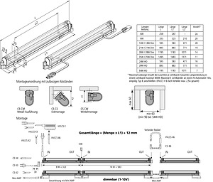 Sehr kompakte Langfeldleuchte, kleiner starrer Verbinder für minimale Leuchtenabstände, senkrechtes Stecksystem ermöglicht ein nachträgliches Entfernen aus dem Lichtband, stabiles Aluminiumgehäuse, einfache Montage durch beiliegende Clipsbefestigung, umfangreiches Zubehör wie Reflektor, Montagewinkel für Lichtvouten, Plexiglasabdeckung, waagerechte oder senkrechte Anschluss- bzw. Verbindungsleitung Verteiler und Einbaubuchsen mit sehr kleinem (D= 7,5mm) Hochvolt-Stecksystem von Tyco AMP, Eck-Montageclipse 45° bzw. Winkel-Montageclipse 90°