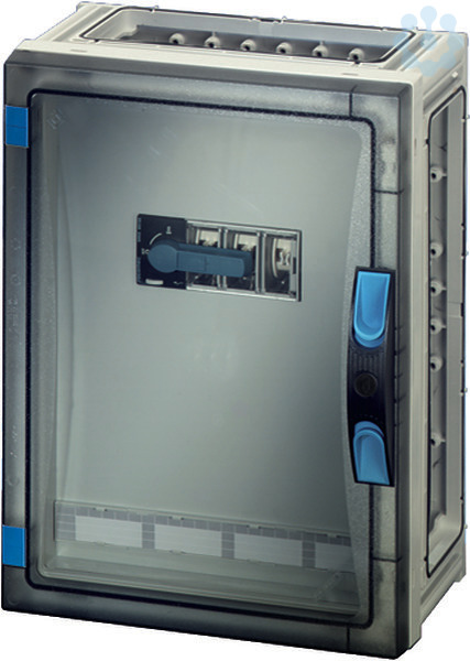 Gehäuse mit Tür für den Bau von Installationsverteilern bis 250 A für die Bedienung durch Laien nach IEC 61439-3. Offene Gehäusewände für die Kombination oder als Einzelgehäuse mit Verschlussplatten. Aus hochwertigem Polycarbonat, schutzisoliert. Schnelle Gehäuseverbindung durch Steckverbinder und integrierte Dichtungen. Große Wanddurchführungen für die elektrische Verbindung der Gehäuse untereinander. Kabeleinführung über Flansche. Wandbefestigung direkt am Gehäuse, über Außenlaschen oder mit Montageschienen. Gehäuse mit Lasttrennschalter 160 A, 3-polig, nach IEC 60947-3. Mit PE- und N-Klemmen. Anschlussraum veränderbar. Mit transparenter Tür und plombierbarem Türverschluss mit Handbetätigung. Schalterantrieb abschließbar.