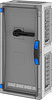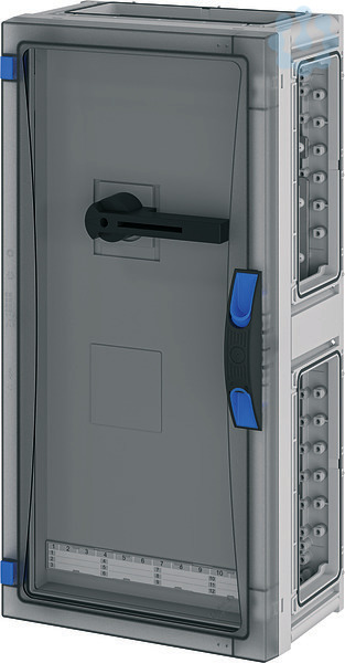Gehäuse mit Tür für den Bau von Installationsverteilern bis 250 A für die Bedienung durch Laien nach IEC 61439-3. Offene Gehäusewände für die Kombination oder als Einzelgehäuse mit Verschlussplatten. Aus hochwertigem Polycarbonat, schutzisoliert. Schnelle Gehäuseverbindung durch Steckverbinder und integrierte Dichtungen. Große Wanddurchführungen für die elektrische Verbindung der Gehäuse untereinander. Kabeleinführung über Flansche. Wandbefestigung direkt am Gehäuse, über Außenlaschen oder mit Montageschienen. Gehäuse mit Lasttrennschalter 250 A, 3-polig, nach IEC 60947-3. Mit PE- und N-Klemmen. Anschlussraum veränderbar. Mit transparenter Tür und plombierbarem Türverschluss mit Handbetätigung. Schalterantrieb abschließbar.