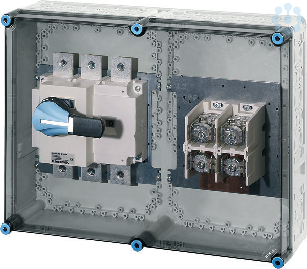 Gehäuse für den Bau von Energie-Schaltgerätekombinationen bis 630 A oder als Einzelgehäuse. Aus hochwertigem Polycarbonat schutzisoliert. Wanddurchführungen mit großen Öffnungen für die elektrische Verbindung der Gehäuse untereinander. Kabeleinführung an allen Gehäusewänden über metrische Vorprägungen oder Anbauflansche. Gehäuse zur Wandbefestigung auch über Außenlaschen oder mit Montageschienen. Gehäuse mit Lasttrennschalter 630 A, 3-polig, nach IEC 60947-3. Mit PE- und N-Klemmen und lösbarer Brücke zwischen PE und N. Griff des Lasttrennschalters abschließbar. Deckelverschlüsse für Werkzeugbetätigung.