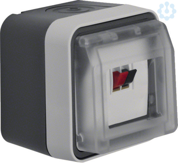 Lautsprecher-Anschlussdose AP W.1 grau. Lautsprecher-Anschlussdose mit Klappdeckel AP, mit Beschriftungsfeld, IP55, mit Steckklemmen (beidseitig), mit einer Einführung für 2 Leitungen und einer Einführung für Leitung oder Rohr, vollflächige Dichtung unter dem Gehäuseboden zur Abdichtung der Gehäuserückseite, mit transparentem, zufallendem Klappdeckel, manuell einrastbar, um den Schutzgrad IP55 zu erreichen, gut zugängliche, trichterförmige Montagelöcher in den Gehäusen, einfache Montage des Einsatzes im Rahmen mit Klappdeckel durch Einrasten, sichere Fixierung des Rahmens mit Klappdeckel am Gehäuse über Bajonett-Schnellverschluss.