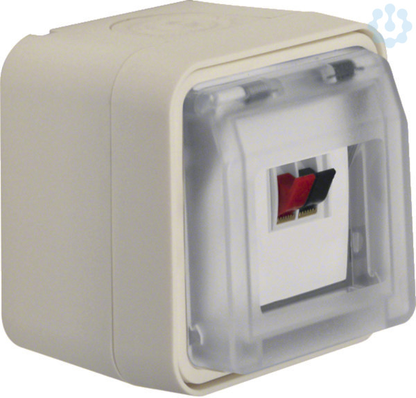Lautsprecher-Anschlussdose AP W.1 polarweiß. Lautsprecher-Anschlussdose mit Klappdeckel AP, mit Beschriftungsfeld, IP55, mit Steckklemmen (beidseitig), mit einer Einführung für 2 Leitungen und einer Einführung für Leitung oder Rohr, vollflächige Dichtung unter dem Gehäuseboden zur Abdichtung der Gehäuserückseite, mit transparentem, zufallendem Klappdeckel, manuell einrastbar, um den Schutzgrad IP55 zu erreichen, gut zugängliche, trichterförmige Montagelöcher in den Gehäusen, einfache Montage des Einsatzes im Rahmen mit Klappdeckel durch Einrasten, sichere Fixierung des Rahmens mit Klappdeckel am Gehäuse über Bajonett-Schnellverschluss.