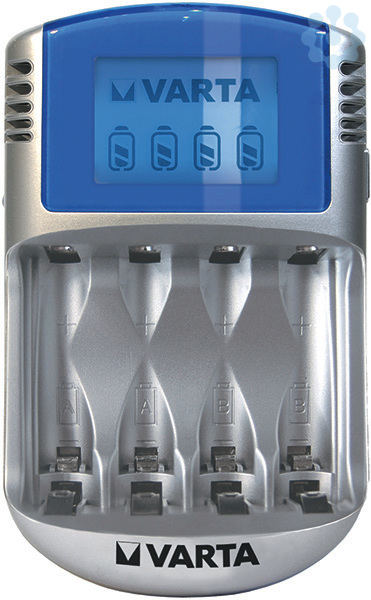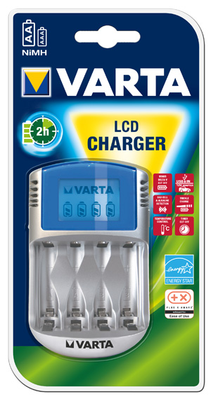 Blaues LCD-Display, lädt 2,4 AA oder 2,4 AAA Akkus, Schnellladung (2-4 Stunden), Ladefortschrittsanzeige, USB-Aufladung (via Laptop, USB-Kabel inklusive), globale Spannung daher weltweit einsetzbar (100 - 240V), inklusive 12V Adapter für KFZ, Erhaltungsladung, Erkennung fehlerhafter, ungeeigneter und falsch eingelegter Batterietypen, Minus Delta V Abschaltung, Temperaturkontrolle, Sicherheitstimer daher keine Überladung möglich, Tisch-Ladegerät.
