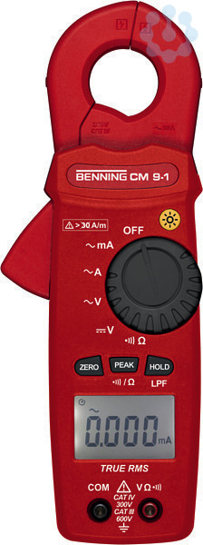 Benning CM 9-1 True RMS-Leckstromzange. Fehlerbedingte Leckströme werden durch Isolationsschwächen oder -schäden verursacht. Mit der CM 9-1 lassen sich alle Fehlerquellen schnell und präzise lokalisieren. Durch vorbeugende Messungen können mögliche Schäden durch unkontrolliert abfließende Leckströme schon im Voraus vermieden werden. Zuverlässiges und einfaches Auffinden von Isolationsfehlern, z. B. defekte Kabel, lose Klemmen, Verschmutzungen, Feuchtigkeit. Messung von Ableit-, Differenz-, Schutzleiter- und Lastströmen in elektrischen Anlagen, Geräten und Maschinen. Anzeige digital. 4-stellige LCD-Anzeige (6000 Punkte). Mit Bildschirmhintergrundbeleuchtung. Ableitstrommessung. Strommessbereich/AC 0.000001 A - 60 A. Stromart Wechselstrom. Höchste Auflösung von 1 µA im 6 mA Messbereich. Messung ohne Abschaltung während des normalen Betriebes der Anlage/des Gerätes. Ideal zur vorbeugenden Instandhaltung und Fehlersuche, Schutz vor Sach- und Personenschäden, Stromausfällen etc.. Spannungsmessung/AC 0,01 V - 600 V