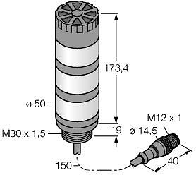LED-Anzeige, Signalsäule, Signaltongeber: Omnidirektional, gedichtet, Dauerton max. 99 dB, Schwarzes Kunststoffgehäuse, Schutz gegen elektromagnetische und hochfrequente Störungen, Schutzart IP50, Kabel mit Stecker M12X1, 150 mm, Betriebsspannung: 18?30 VDC oder 24 VAC bei jeweils 45mA pro LED-Farbe, Eingänge: PNP / NPN, Farben: Grün (COL 1) / Gelb (COL 2) / Rot (COL 3)
