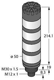 LED-Anzeige, Signalsäule, Signaltongeber max. 92 dB, Schwarzes Kunststoffgehäuse, Schutz gegen elektromagnetische und hochfrequente Störungen, Schutzart IP50, Stecker M12X1, Betriebsspannung: 18?30 VDC oder 24 VAC bei jeweils 45mA pro LED-Farbe, Eingänge: PNP / NPN, Farben: Blau (COL 1) / Grün (COL 2) / Gelb (COL 3) / Rot (COL 4)