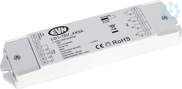 4-Kanal Dimmermodul fuer Unicolor-LED-Leuchten mit 1-10V-Schnittstelle (aktiv). Geeignet fuer Leuchten mit einer Betriebsspannung von 12, 24 und 36V/DC. Die tatsächlich zu verwendende Eingangsspannung ist abhängig von der benötigten Spannung der zu dimmenden Leuchte. 1x Eingang fuer 12-36V/DC, 4x Eingang fuer 1-10V-Schnittstelle und 4x Ausgang fuer 12-36V/DC. Die Ausgänge können separat gedimmt werden, ebenso können die 4 Eingänge primärseitig gebrueckt werden, um alle Ausgänge synchron zu dimmen. Die Schraubklemmen sind fuer Kabel von 0,5mm². - 1,5mm². geeignet. Technische Daten: ta: -20°.C - 50°.C, tc: 75°.C, max. Ausgangsleistung je Kanal: 5A, 60W bei 12V/DC, 120W bei 24V/DC und 180W bei 36V/DC.